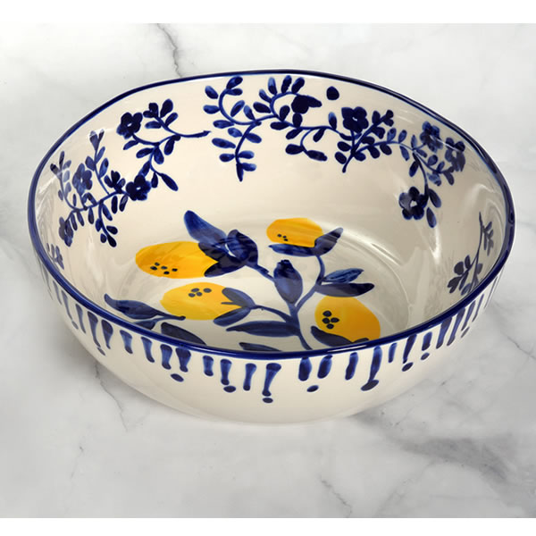 The 30cm Eredita Limone Bowl captures the warmth of Italy with its hand-painted lemon motif, cobalt-blue rim, and floral accents. Perfect for serving pasta, salads, or fruit, each ceramic bowl is a one-of-a-kind piece of artisan craftsmanship.